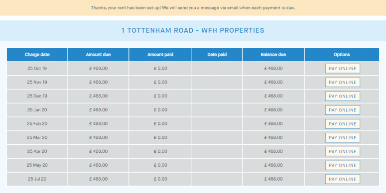 On the Rents page you can view the dates and amounts due, and use the Pay online button to make the payments.